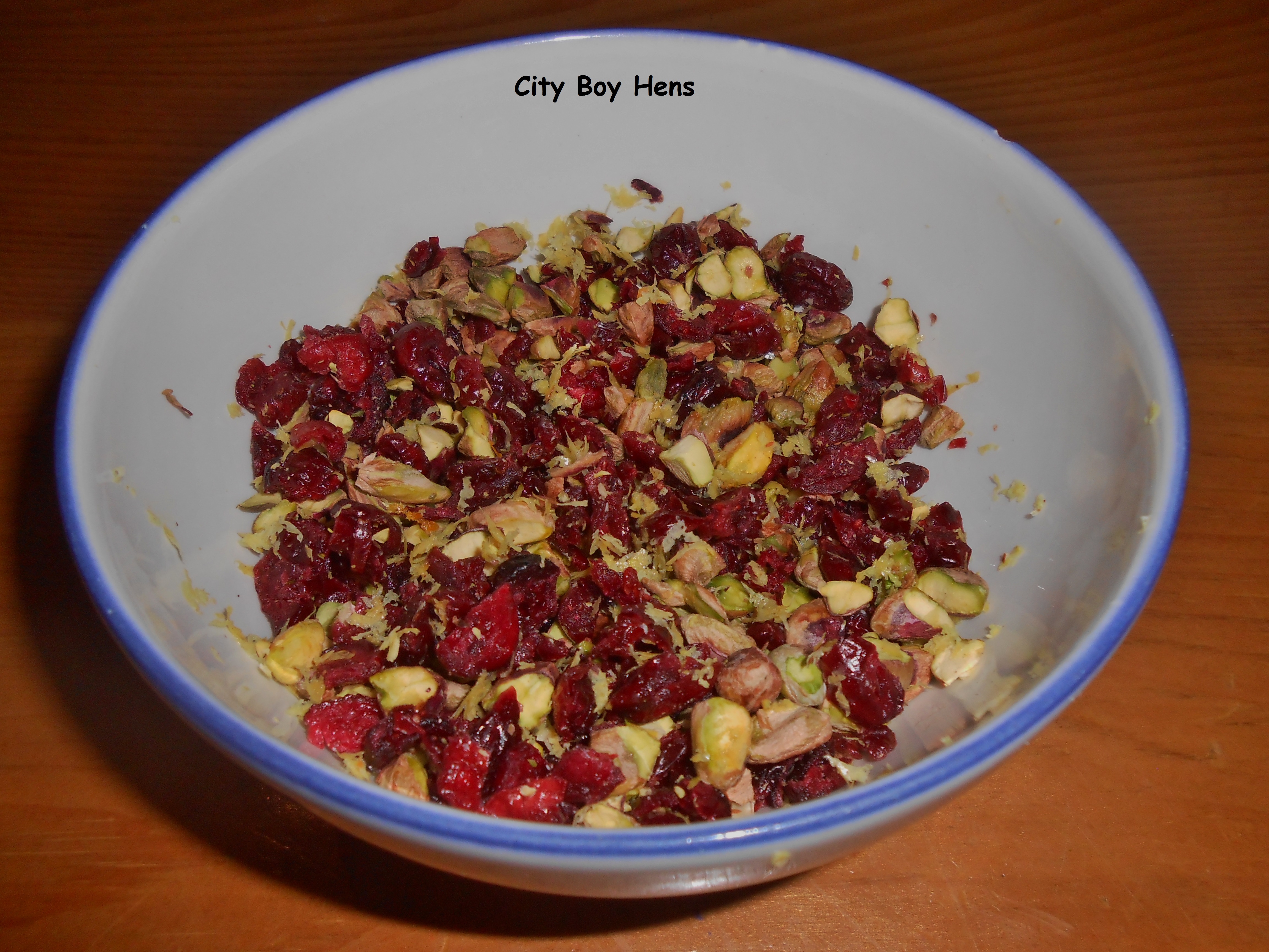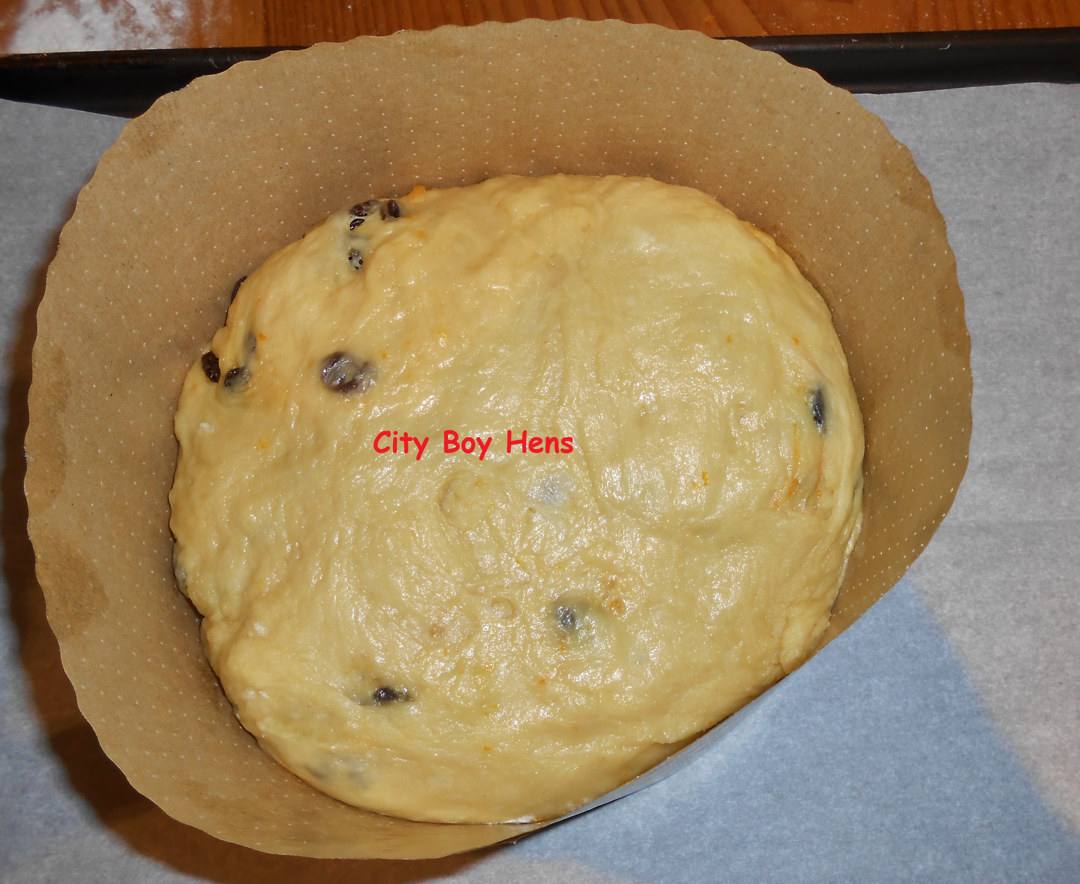Once the dough has doubled in size, turn it out on to a lightly floured surface and “punch” it down. You want to get the air out of the dough. Next, pat the dough out and add the fruit to the middle. Begin gently kneading until the fruit is evenly distributed throughout the dough ( a few minutes). Form the dough into a ball and place it into a Panettone mold or greased pan.