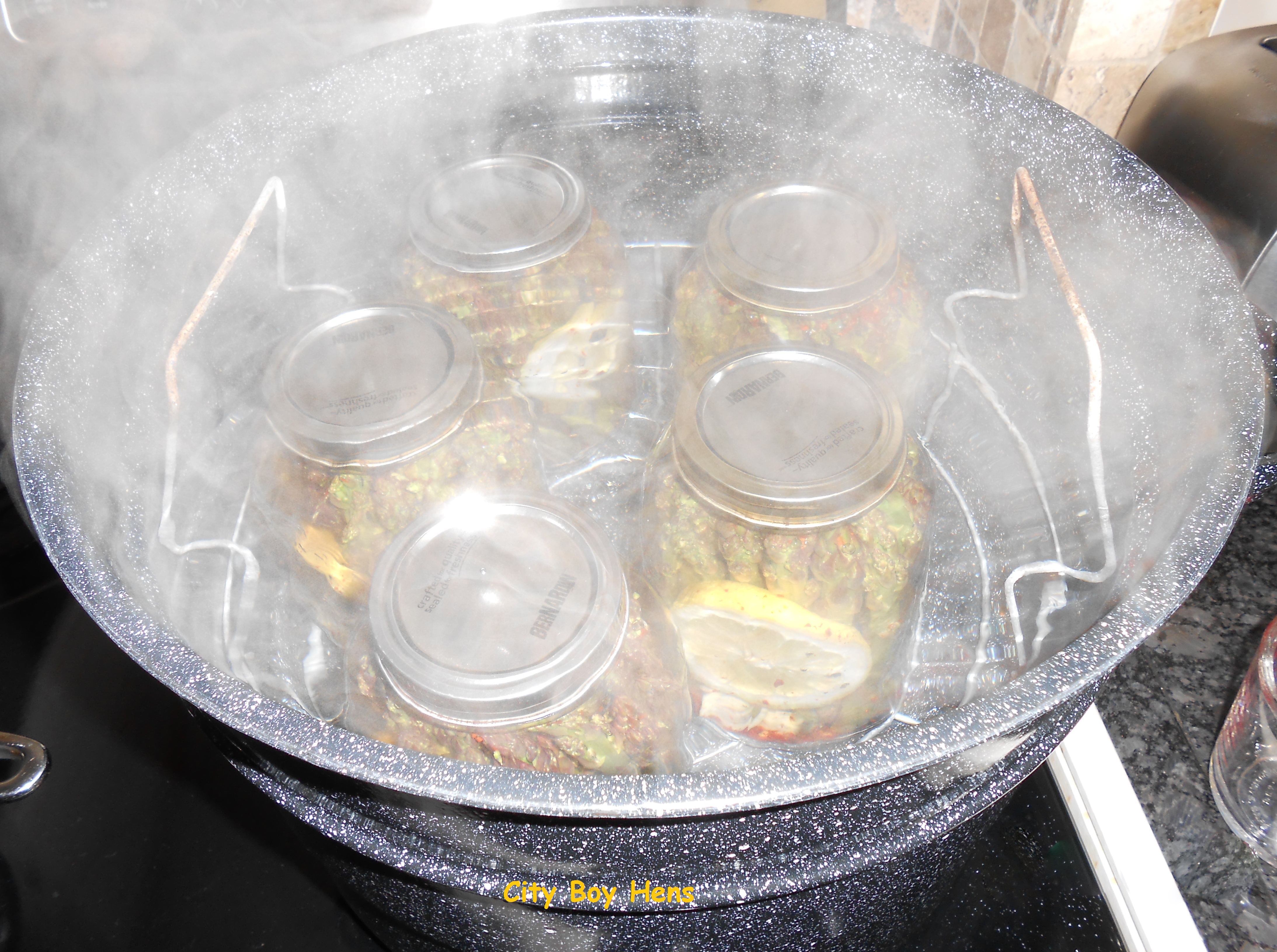 The water bath is debatable and many people omit this step. Some rationalize the omittance by claiming that the boiling brine is enough to kill any bacteria that may be left on the asparagus. I also recognize that this step is a pain in the butt and can be quite dangerous because you are transferring a relatively heavy jar into and out of boiling water. With that said, I feel better eliminating my family’s chance at botulism and using a canning tongs to work the jars into and out of the boiling water. This process should be done for 15 minutes.