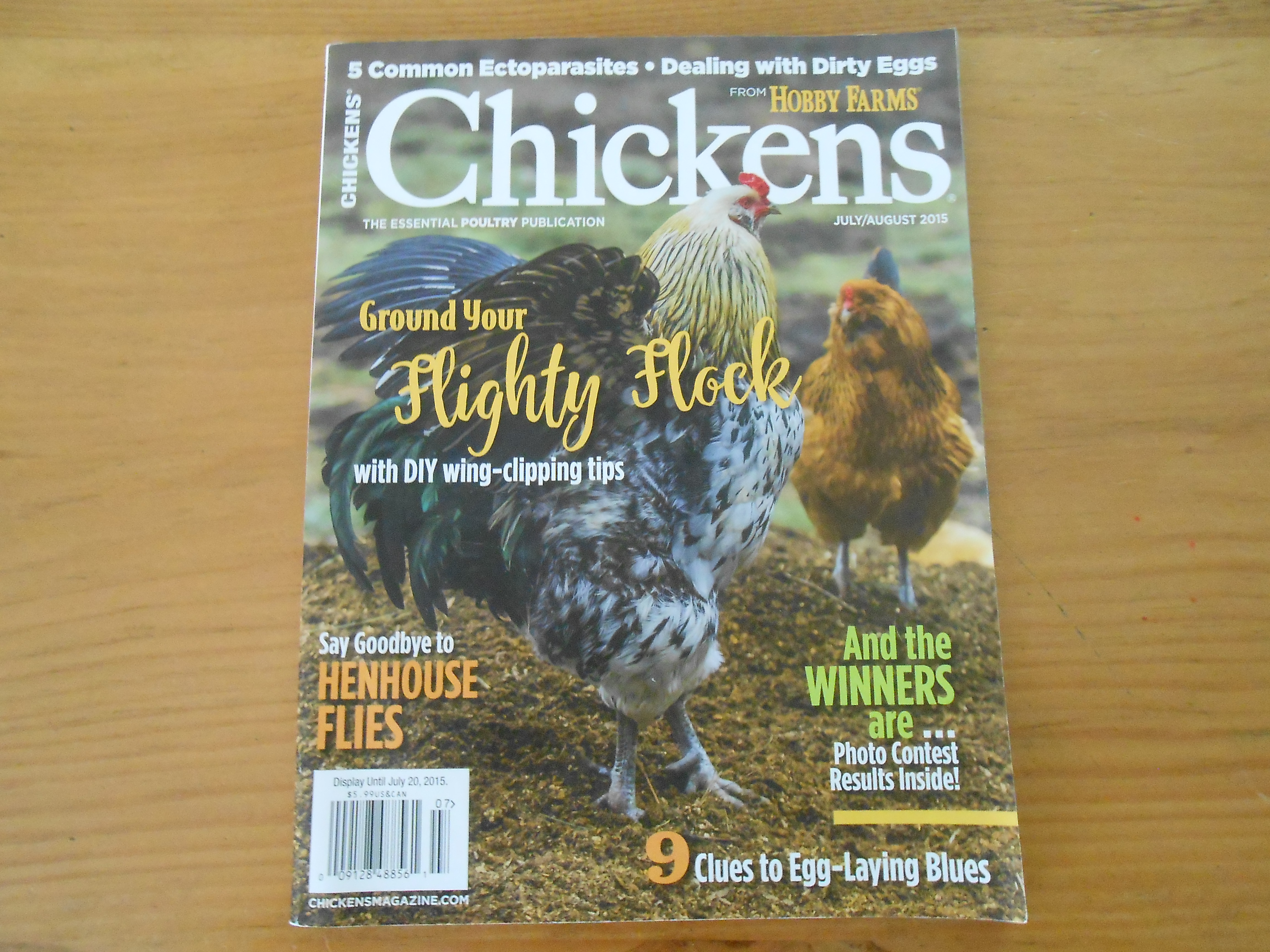 “Well Swif………..we finally made it to the big leagues. Remember back in late winter when I wrote the article ‘Ground Your Flighty Flock’ and you volunteered to have your flight feathers trimmed for the occasion. Well……..You and I are now the July/August FEATURE in Chickens Magazine. I’m pretty darn proud and I can tell that you are really stoked by the way you’re struttin’ around the backyard. I told you that the “trim” would be worth it.