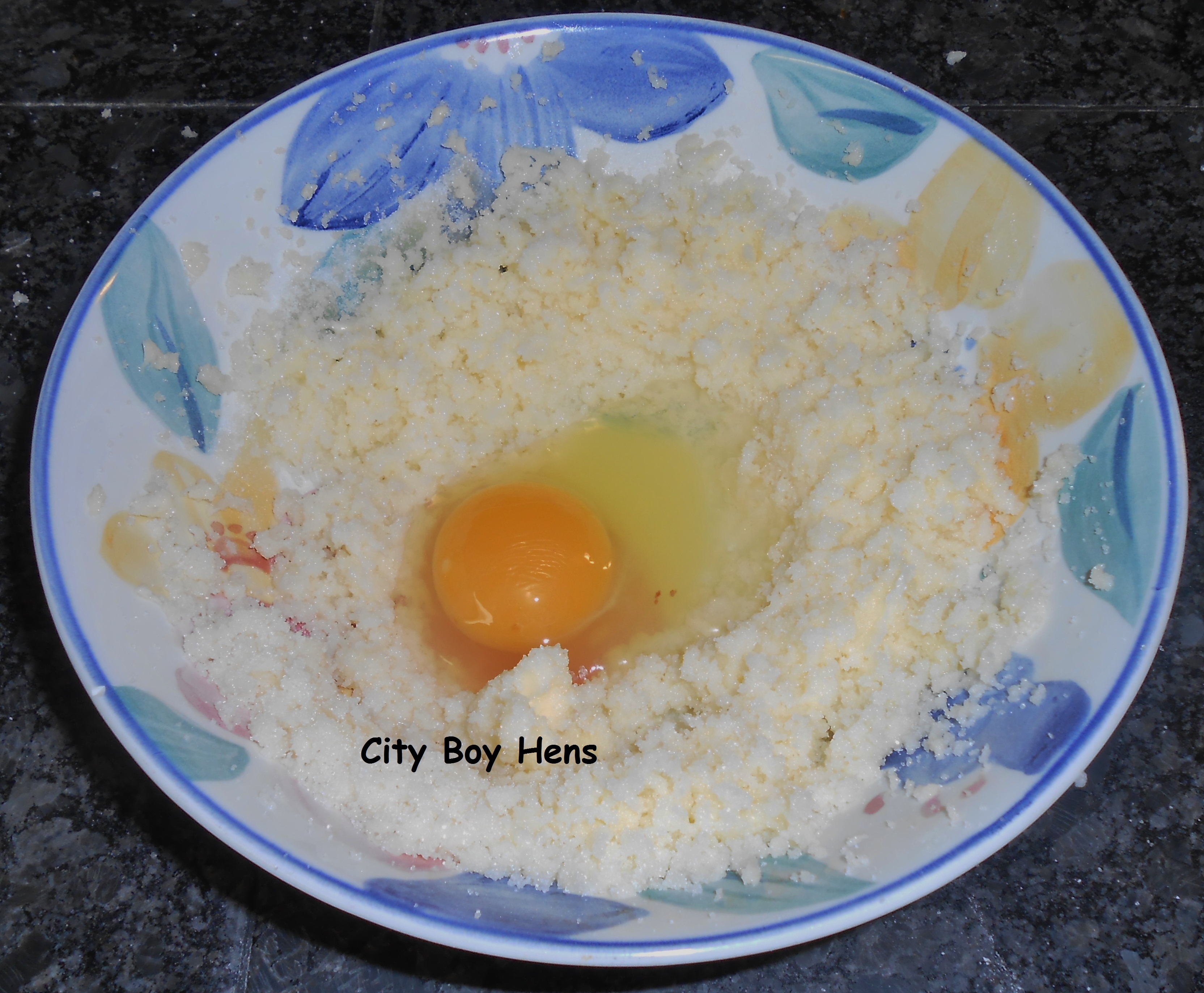 Cream together butter and sugar in a separate bowl. Beat in both eggs.