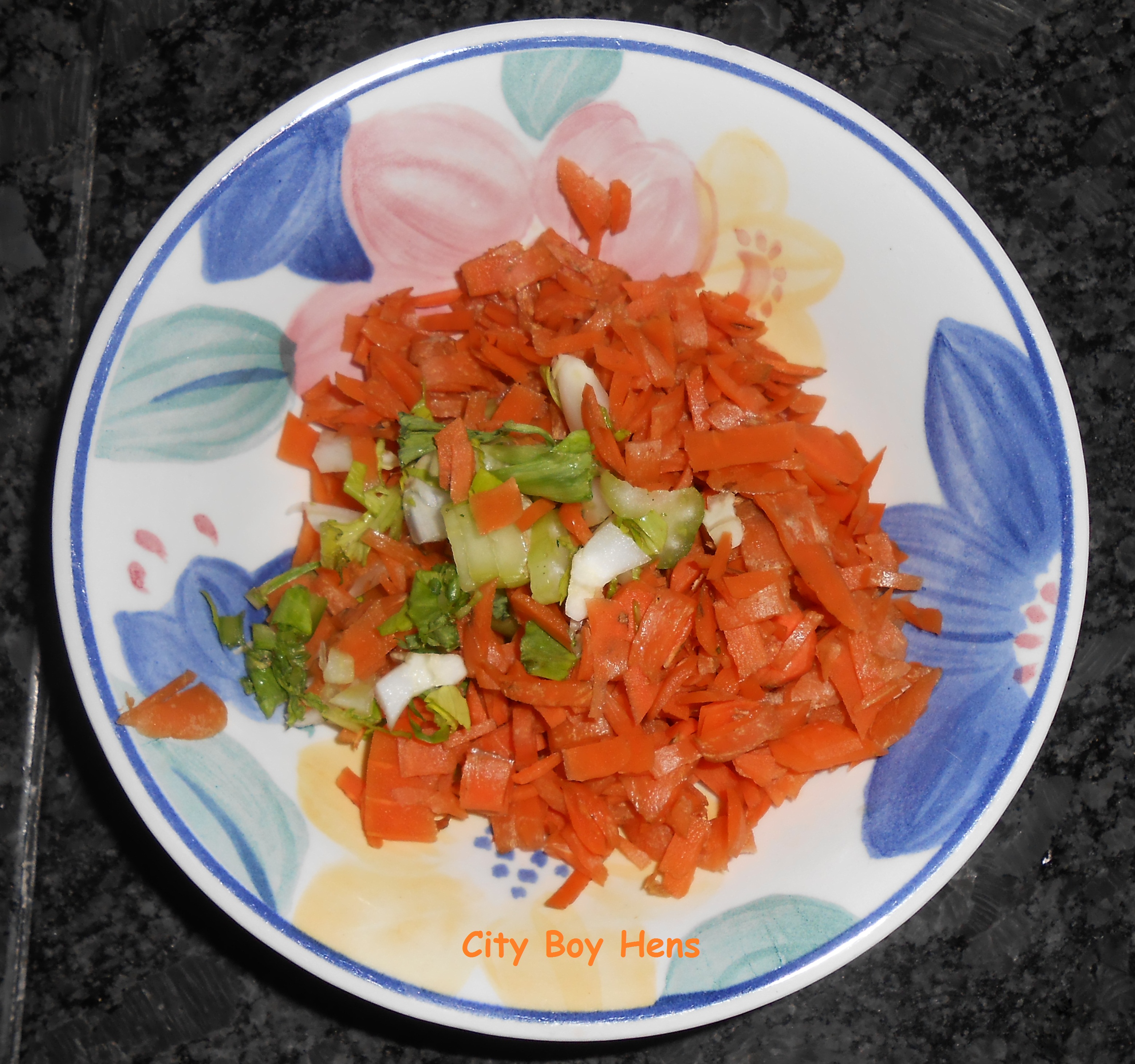 Combine carrots, celery and onion into a food processor until it turns into a fine texture.