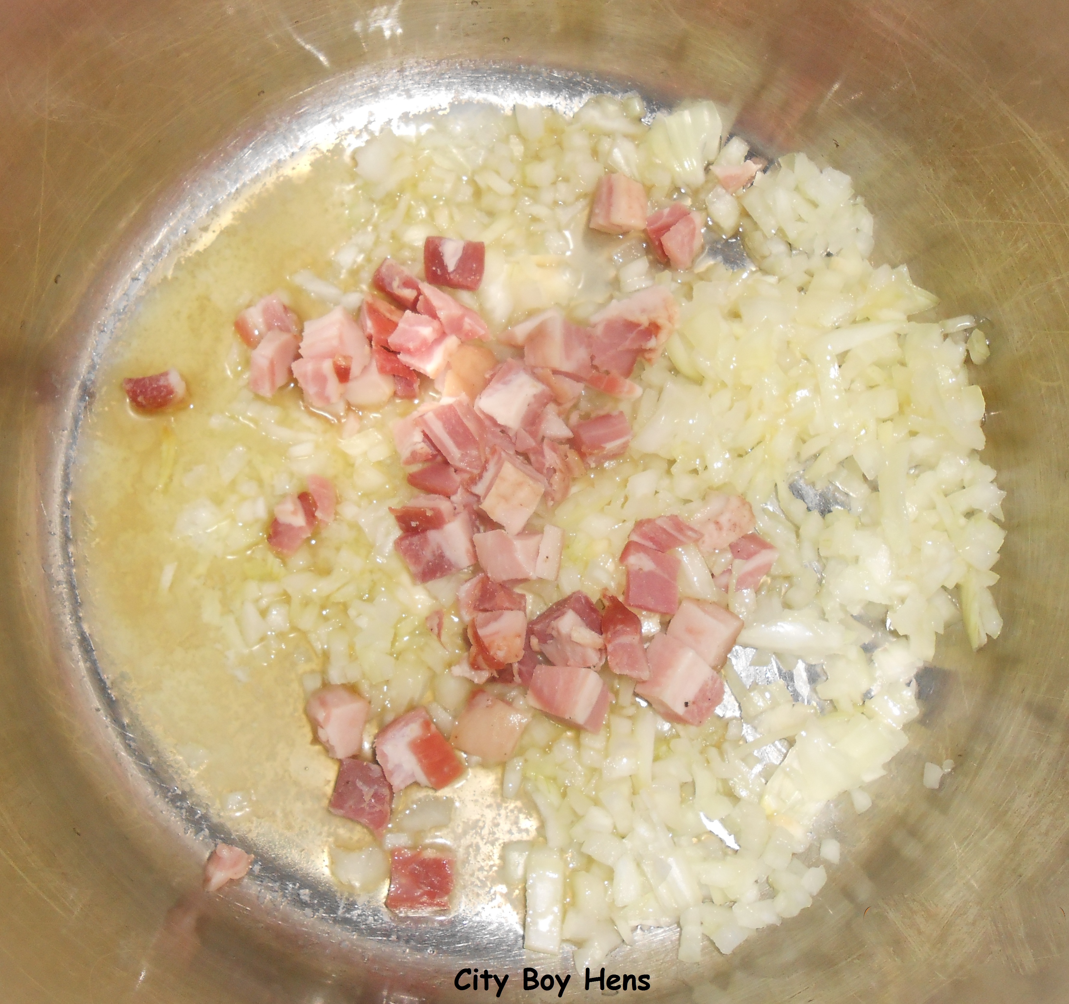 In a large pot, melt butter and add olive oil. Add onions, garlic and pancetta. Cook for 3 minutes or until onions become soft & translucent.